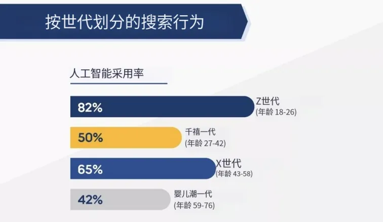 其次,在进行个性化、复杂交易的时候,AI搜索的用户满意度要比传统搜索高出18%,而年轻一代对AI搜索和采用率高达82%。