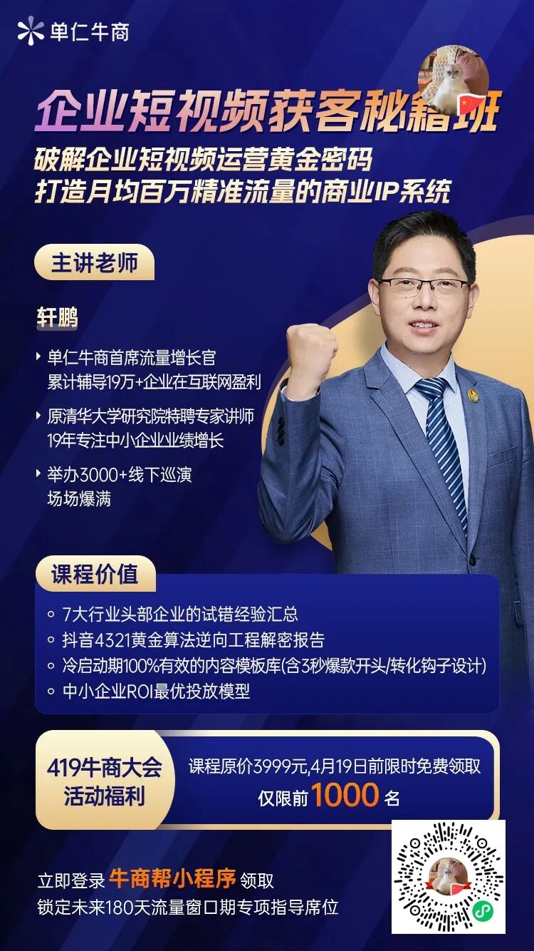 《企业短视频获客秘籍班》原价3999元,现作为牛商大会专属福利,面向前1000名注册牛商帮小程序的企业限时免费开放。扫描上方二维码即可领取 。