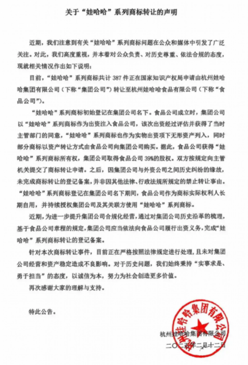 宗馥莉本来打算把商标进行转移,但很明显,商标转移失败,需要得到全体股东的一致同意。