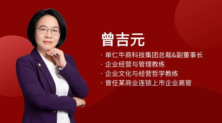 曾吉元老师:单仁牛商科技集团总裁&副董事长、企业经营与管理教练、资深战略顾问,深耕企业成长领域多年。她擅长将企业文化( MVV )与经营目标深度融合,帮助企业从初心使命中汲取增长的磅礴力量,真正实现“统一方向,形成合力”。