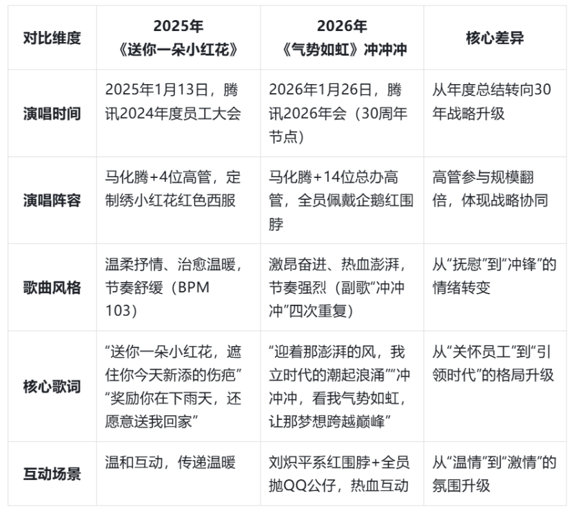 而在 2025年年会上,小马哥的主题曲是《送你一朵小红花》 ,这 两首歌的风格跟 背景截然不同, 映射了腾讯从“降本增效”到“AI战略决战”的关键转型。
