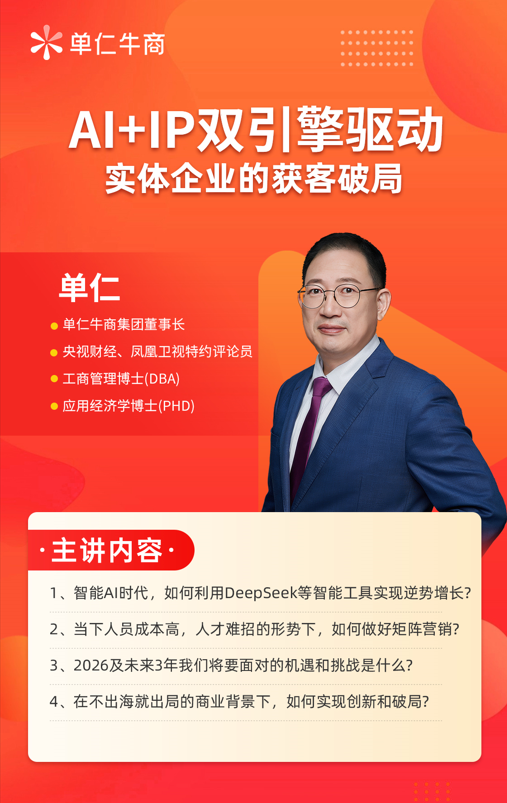 央视财经、凤凰卫视特约评论员单仁博士,深耕全域营销20年,累计帮助超20万家企业实现互联网转型。他将系统阐述如何运用“AI+IP”双引擎,为实体企业打造高效、精准的获客体系,实现业绩的逆势增长。