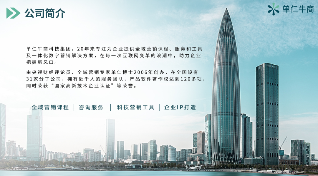 单仁牛商科技集团,20年来专注为企业提供全域营销课程、服务和工具及一体化数字营销解决方案,在每一次互联网变革的浪潮中,助力企业把握新风口。