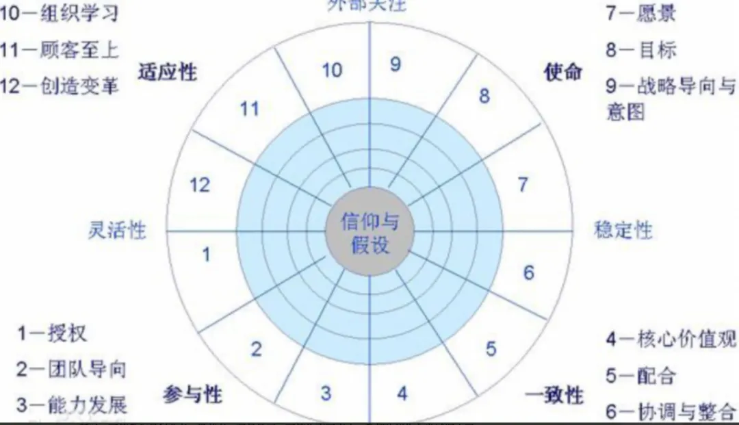 如果一家企业的文化强调适应性与参与性,那这个组织就偏向于快速反应,更加灵活,如果他们是强调使命和一致性,这样的组织更偏向于稳定。